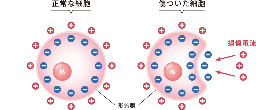 また、細胞、組織が傷つくと 修復のために流れる損傷電流と似た性質があり